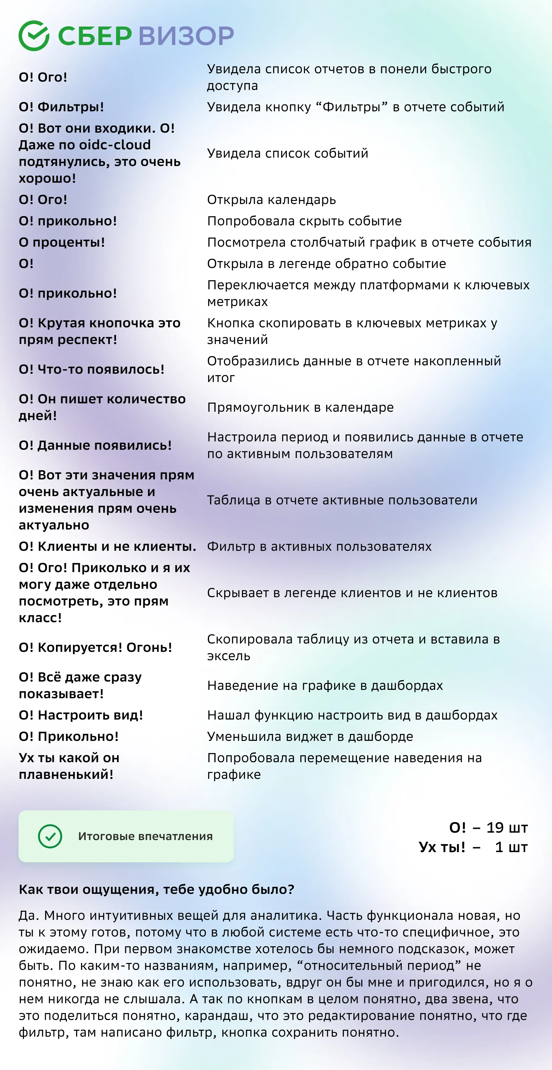 Результаты: выявлены критичные UX-проблемы и баги. Совместно с командой приоритизировали задачи и внесли изменения до масштабного релиза